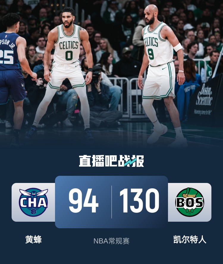 比赛开始,黄蜂反客为主打出10-4开局,怀特里突外投连续砍分带队追分,随后双方比分持续胶着,首节双方打成25平,次节双方继续胶着拉锯战,黄蜂全民皆兵始终保持微弱领先,普理查德和霍福德连续扔进三分回应,波尔津吉斯两罚一中助绿军半场领先1分。下半场,绿军上来就11-2拉开双位数领先,小库里外线连中三分助黄蜂追分,但豪泽外线能回应,塔图姆发力有攻有传带队三节领先16分,末节普理查德继续外线发炮,绿军一波13-3攻击波直接拉开近30分领先,双方开始练兵,最终凯尔特人130-94大胜黄蜂,送对手6连败。