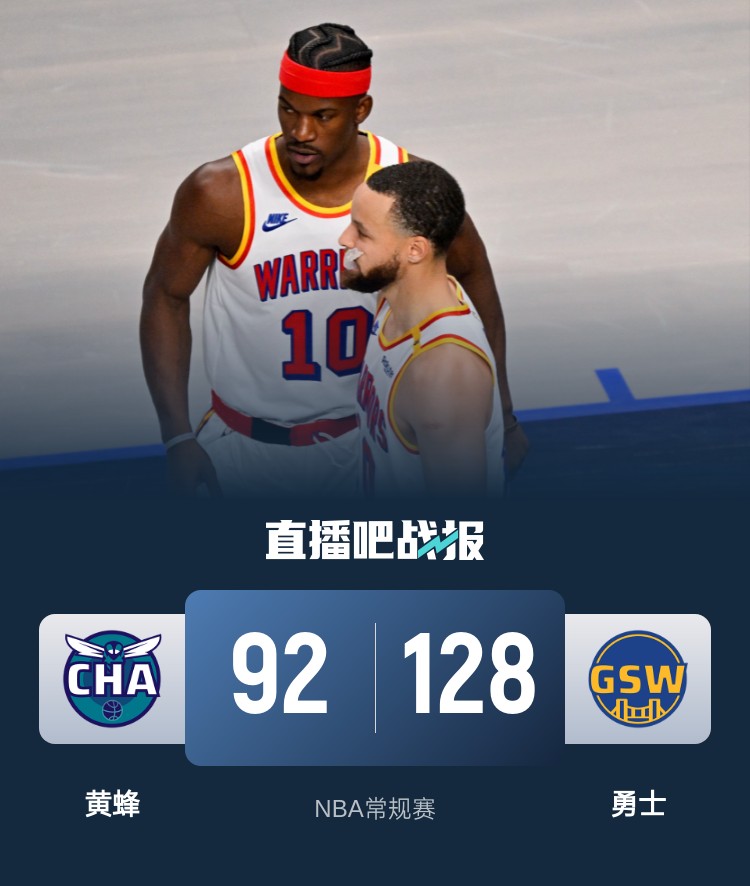 首节开局勇士打得不太顺半节时间仅仅得到9分,不过后半段替补上阵的佩顿连拿5分唤醒球队进攻,勇士跨节送上一波27-7的攻势一举扭转局势并拉开两位数分差;黄蜂打得极其被动一度落后19分,不过最后1分多钟里他们连续飚进三记三分止血并带着15分劣势进入下半场。休息归来勇士彻底接管比赛,他们多点开花单节轰下41分,虽然没有绝对高分但三节未打完6人得分上双,净胜17分的同时在第三节拿到32分的领先;巨大优势之下末节也成为练兵时间比赛早早失去悬念。最终,勇士大胜黄蜂迎来4连胜。