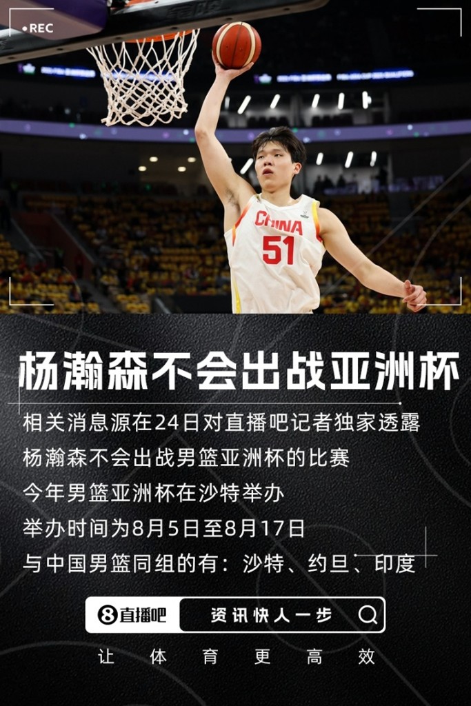直播吧独家:杨瀚森不会出战男篮亚洲杯的比赛