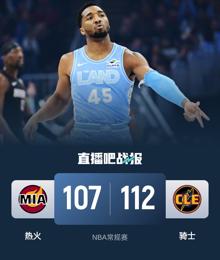 比赛上来,两队就打得十分胶着,残阵的热火丝毫不落下风,场上比分交替领先,次节热火一度落入下风,分差被拉开到17分,好在是节末他们轰出一波13-0的攻势,半场结束时骑士仅领先4分;下半场回来,热火的反扑势头还在继续,在乐福的带领下他们一度完成反超,末节热火先打一波7-0的小高潮,而骑士这边进攻陷入麻烦,半节的时间只拿到7分,比赛悬念保持到了最后,关键时刻阿德巴约黄油手失误,李凯尔也造成米切尔失误,邓罗虽然三分命中但先踩线了,加兰两罚全中没有再给热火机会,最终骑士以112-107险胜热火迎来12连胜,同时也锁定季后赛席位。