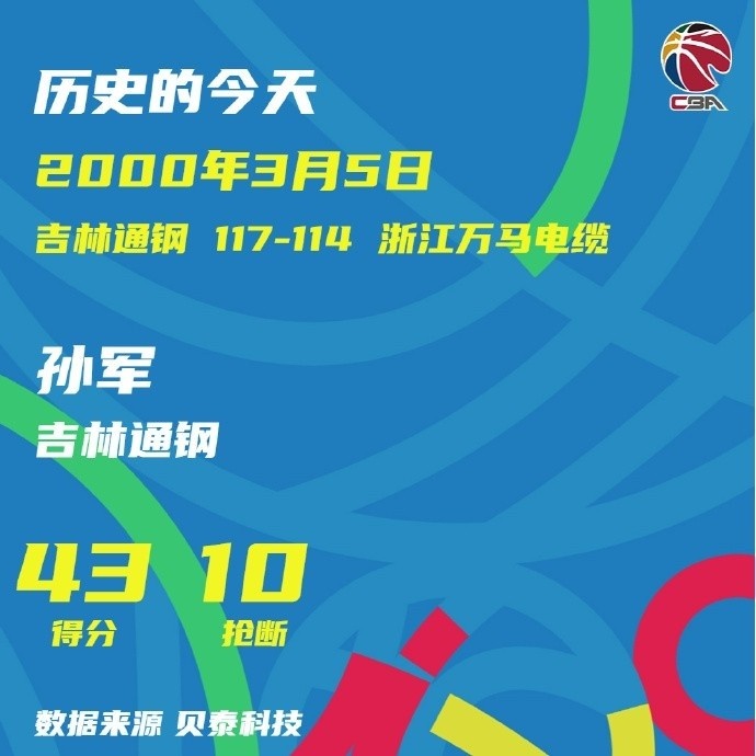 3月5日讯 2000年的今天,孙军砍下40分10抢断外加5记三分,成为CBA历史唯一一个做到这点的球员。
