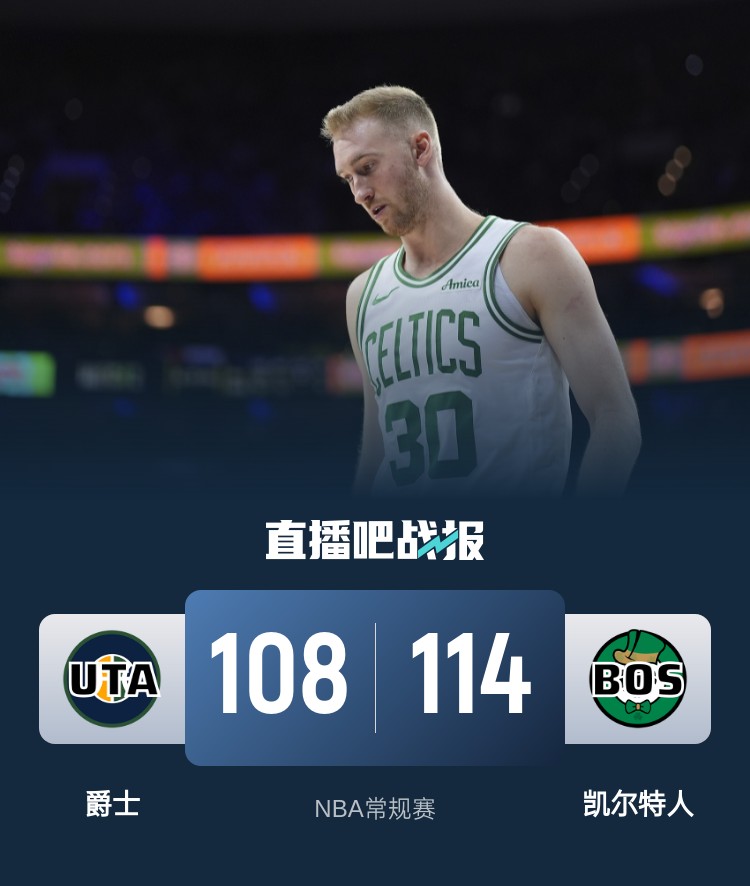 首节一上来两队比分一度紧咬,科林斯外线手感不佳内线连续取分,双方你来我往陷入僵持,首节结束时凯尔特人领先1分,次节回来,怀特突然爆发单节独得13分,率队中段开始发力拉开比分,半场战罢,凯尔特人确立6分优势。易边再战后豪泽箭如雨下飚中7记三分,单节狂揽23分率队彻底扩大分差,三节结束后凯尔特人已经领先21分,末节上来,爵士轰出34-11攻击波抹平分差,但豪泽飚中大心脏三分后布朗两罚全中,爵士逆转未果,最终凯尔特人114-108力克对手迎来5连胜,同时送给爵士6连败。