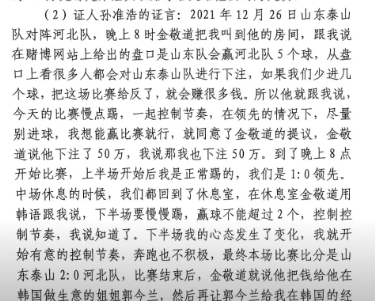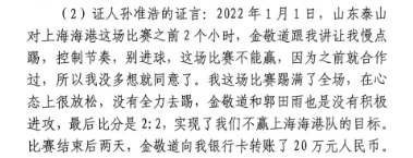 证言中,孙准浩表示在泰山2-2平海港之前,金敬道说让慢点踢这场不能赢。赛后,金敬道给孙准浩20万人民币;在2-0河北之前,孙准浩跟着金敬道下注50万,这场比赛结束后金敬道把钱给金敬道姐姐郭今兰,郭今兰再给孙准浩的哥哥。