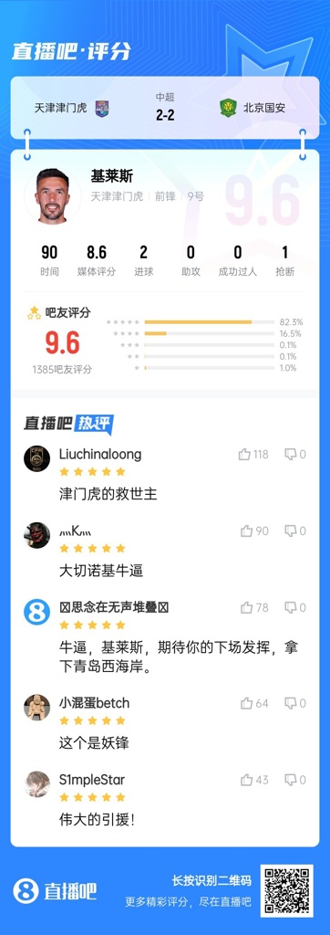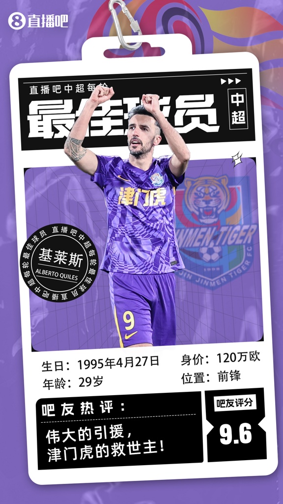 【直播吧】中超第4轮最佳球员:基莱斯当选,为了天津永远进攻!