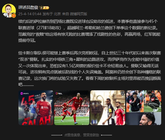 04月14日讯 英超第32轮,曼联客场1-4纽卡斯尔联,赛后,评述员詹俊在社媒发表点评。