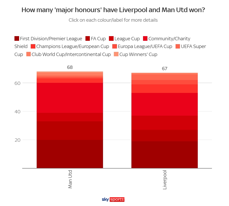 英媒天空体育统计了利物浦与曼联两队队史重要赛事冠军数。如果算上社区盾,利物浦目前已经获得了67个冠军,距离曼联只差一座。但如果曼联本赛季夺得欧联杯冠军,利物浦将仍然落后曼联一座奖杯。