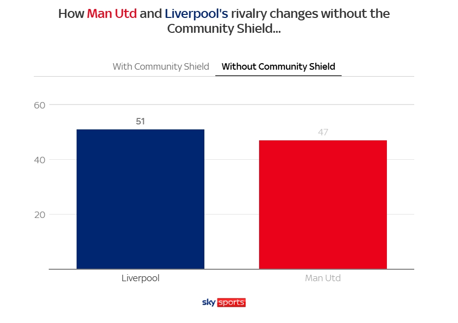 但如果不算上社区盾,利物浦已经在奖杯数上超过曼联,利物浦为51座,曼联为47座。这还是不算本赛季英超冠军的情况。