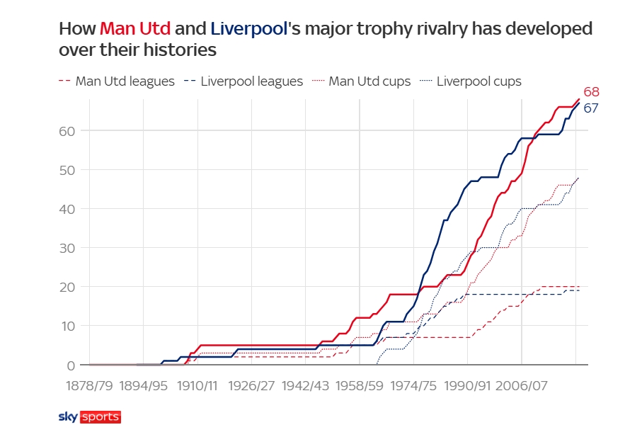 1992 年英超联赛开始时,利物浦比曼联多18座奖杯,但由于弗格森带领曼联取得了前所未有的成功,2010/11 赛季的英超和社区盾双料冠军让红魔自20世纪70年代初以来首次领先。随后曼联几乎一直处于领先。若曼联还想保持优势,他们必须在本赛季欧联杯上有所作为。