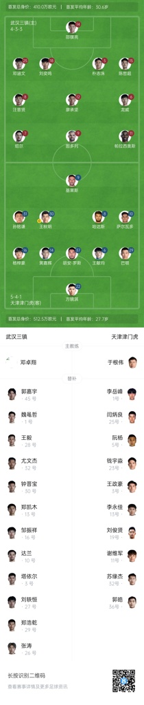 04月27日讯 北京时间19点,中超第9轮,武汉三镇主场迎战天津津门虎,赛前双方公布首发。