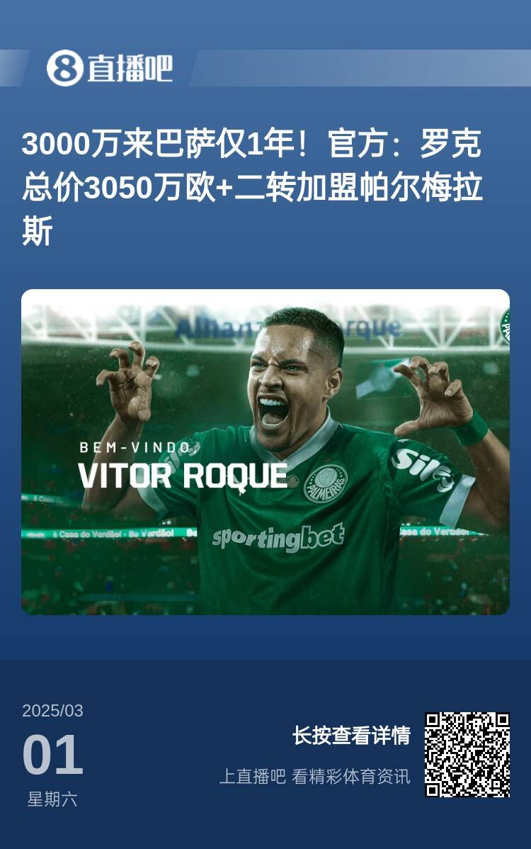 本赛季罗克被租借至贝蒂斯,33场7球2助的数据不算糟糕,但巴萨选择在冬窗与贝蒂斯达成协议,提前结束租借。随后,巴萨转手就将其卖回巴西球队帕尔梅拉斯,转会费2550万欧+500万欧浮动,外加二转分成条款。此时的罗克身价已经只剩2000万欧。