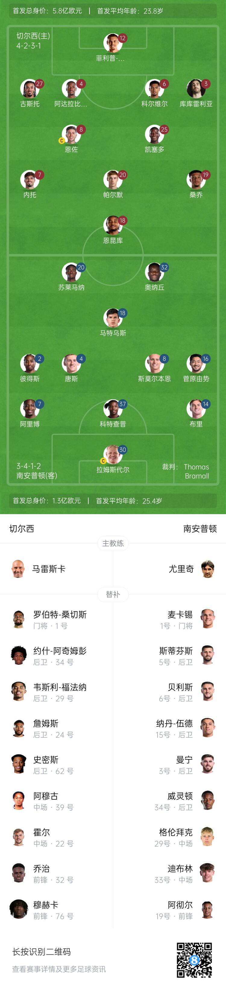 切尔西替补:1-罗伯特-桑切斯、24-里斯-詹姆斯、29-韦斯利-福法纳、34-阿奇姆蓬、62-塞缪尔斯-史密斯、22-霍尔、39-阿穆古、32-乔治、76-穆赫卡