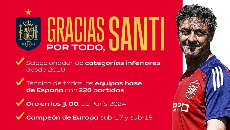 在执教西班牙各级国家队的220场比赛中(10场U15、16场U16、105场U17、14场U18、39场U19、30场U21和6场国奥),桑蒂为西班牙足球做出了巨大贡献。西班牙足协全体员工对他的付出表示衷心感谢,并祝愿他在新的职业生涯中一切顺利。