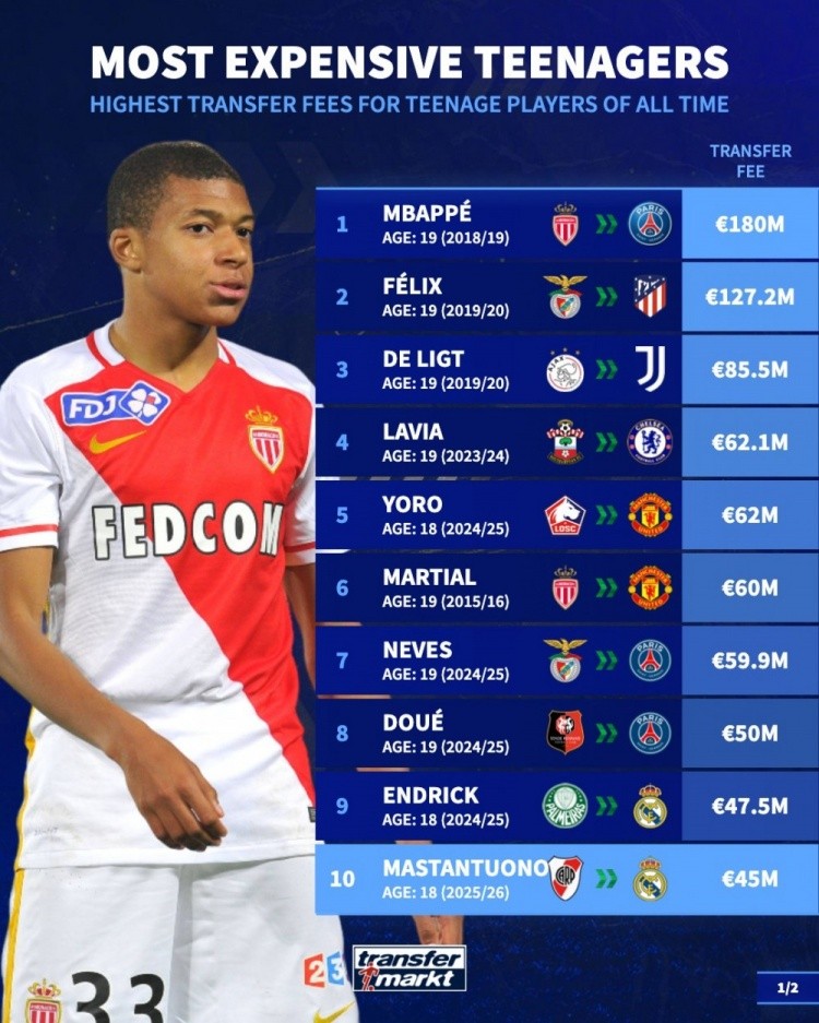 足坛历史U20球员转会费榜:姆巴佩居首,菲利克斯、德里赫特前三