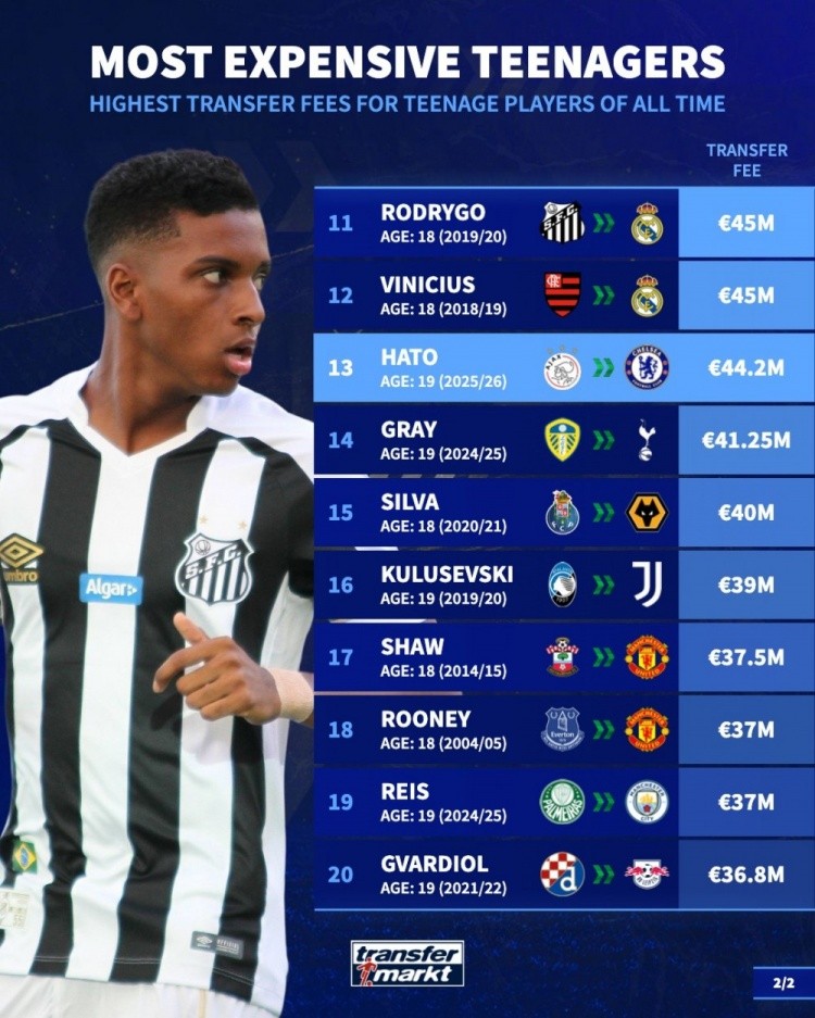 足坛历史U20球员转会费排名: