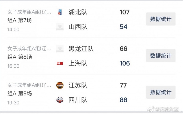 湖北队107-54山西队,刘贝轰下20分8篮板8助攻,彭华倩20分6篮板10助攻,李佳桐16分。山西队翟若云空砍16分。