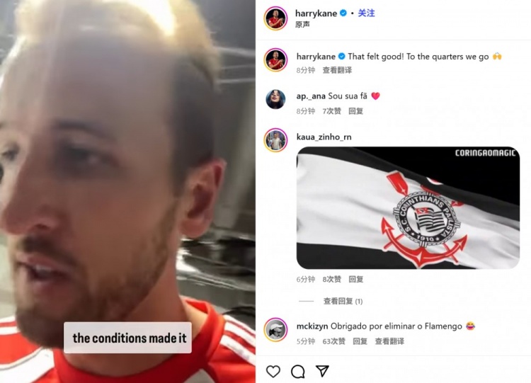 凯恩也在赛后更新社媒动态并配文:“感觉很棒,我们晋级八强了!”