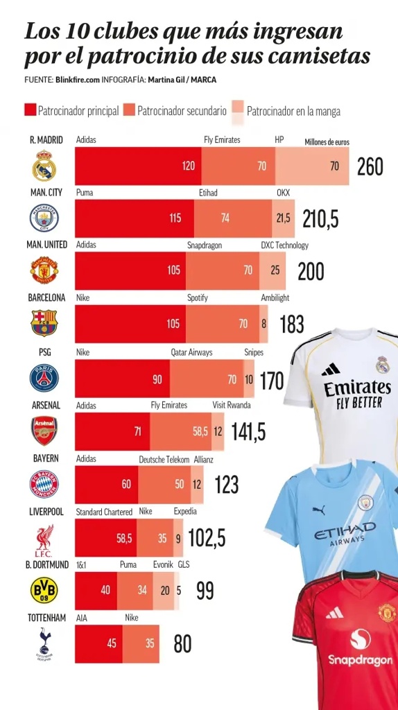 球衣年赞助排行榜:皇马2.6亿欧世界第一,曼城第二,曼联第三