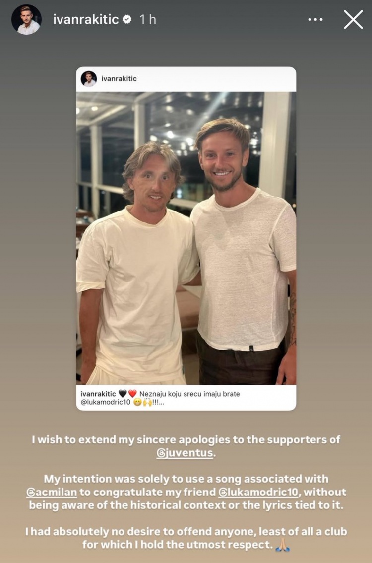 拉基蒂奇写道:“我向尤文的球迷表示诚挚的歉意。我的初衷只是用一首与AC米兰相关的歌曲来祝贺我的朋友莫德里奇,完全没有意识到这首歌的历史背景或歌词内容。我绝对无意冒犯任何人,尤其是我非常尊重的尤文俱乐部。”