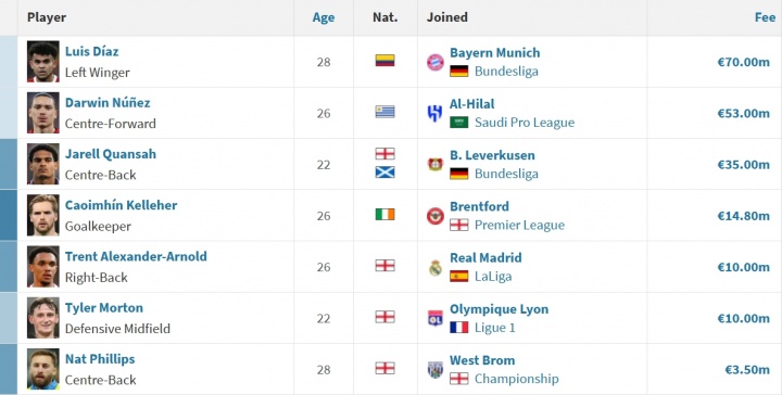 利物浦今夏球员出售情况(总计约2.253亿欧,不算浮动)↓