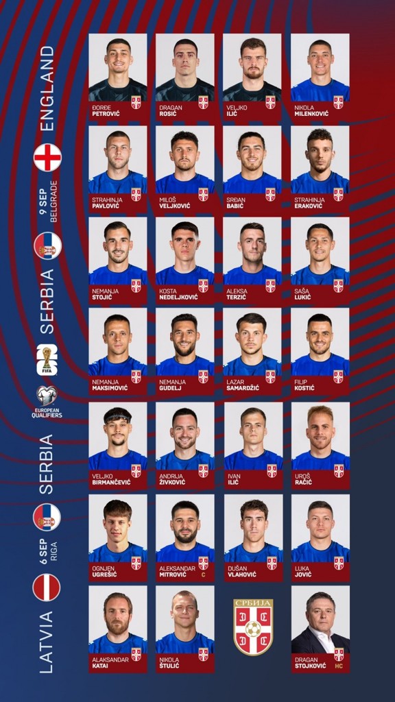 9月世预赛,塞尔维亚将先后对阵拉脱维亚、英格兰。