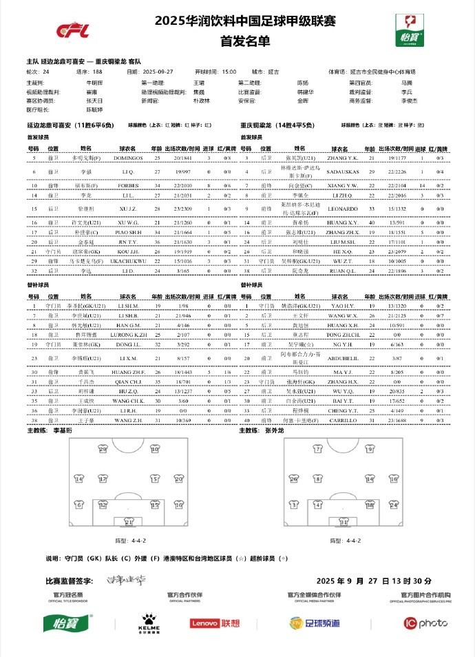 9月27日讯 2025华润饮料中甲联赛第24轮,延边龙鼎可喜安 vs 重庆铜梁龙首发名单出炉,本场比赛是重庆铜梁龙新任韩国籍主教练张外龙首秀。