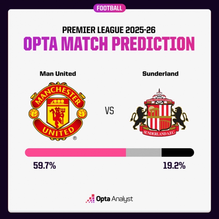 据opta的超级计算机模拟,曼联本场比赛的胜率为59.7%,平局概率为21.1%,桑德兰获胜的概率为19.2%。