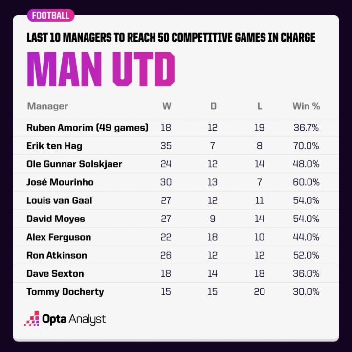 阿莫林5位前任的50场里程碑均不胜,黑猫近31次做客曼联仅赢1场